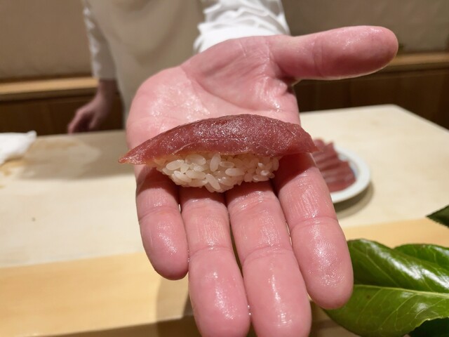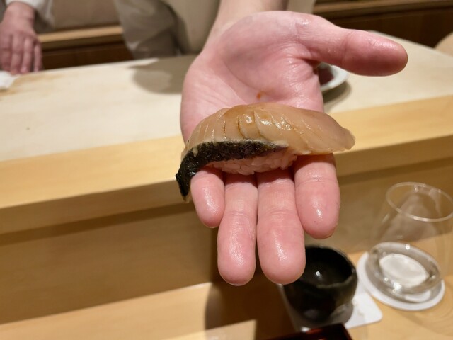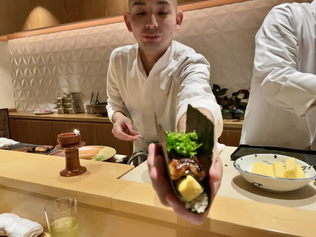 手渡しで供される鰻 玉子真丈 花山椒の手巻きと