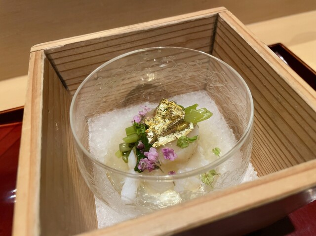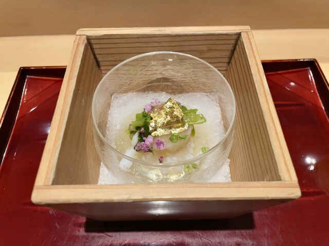 (貝寄せの下に)帆立と伊勢海老 土佐酢ジュレ 金箔