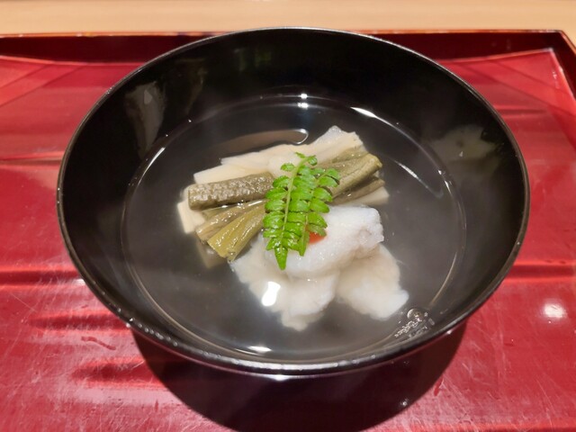 大原木(おはらぎ)に見立てた筍とぜんまいの干瓢巻き おこぜの梅肉添えの椀