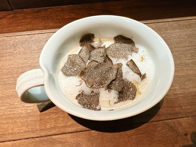 菊芋のポタージュ ブッラータチーズと自家製ベーコン 黒トリュフがけ2