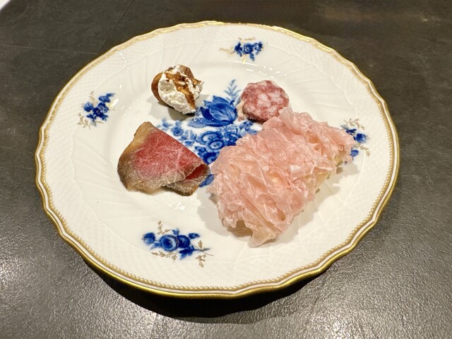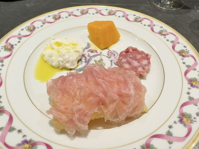 生ハムとニョッコフリット、生サラミ、自家製ブレザオラ(シキンボ)、黒イチジクとリコッタチーズ