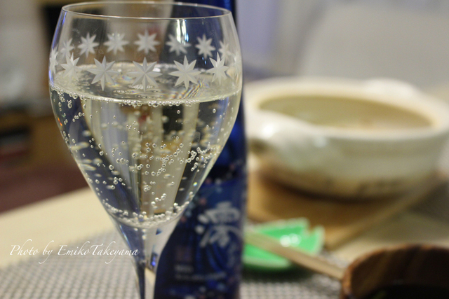日本酒はスパークリング澪を、ティファニーのグラスで。