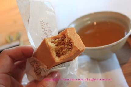 さて、パイナップルケーキ。シブヤ経済新聞によると「日本限定商品を販売する同店。許さんが幾度と来日する中で日本の食文化を体験し「(日本人は)より精巧なもの好む」と感じたことから、「台湾の味を日本の高さまで高めたい」と同店オープンに向け新たに商品を開発した。日本産小麦や抗生物質を食べていない鶏の卵、AOP認証の仏エシレ社の発酵バターを使うほか、「(日本人は)すっぱすぎるのは得意ではないのでは」と、台湾中部・台湾八卦(はっけ)山麓の丘陵で育つパイナップルは6月~7月に取れるもののみを使うなど素材にこだわる。同商品専用の型や、工場内には品質の安定を図り同商品専用の生産ラインを用意したほか、パッケージは日本人デザイナーに依頼した。価格は、5個入り=1,500円、10個入り=3,000円。」とのこと。結構こだわってるね~。