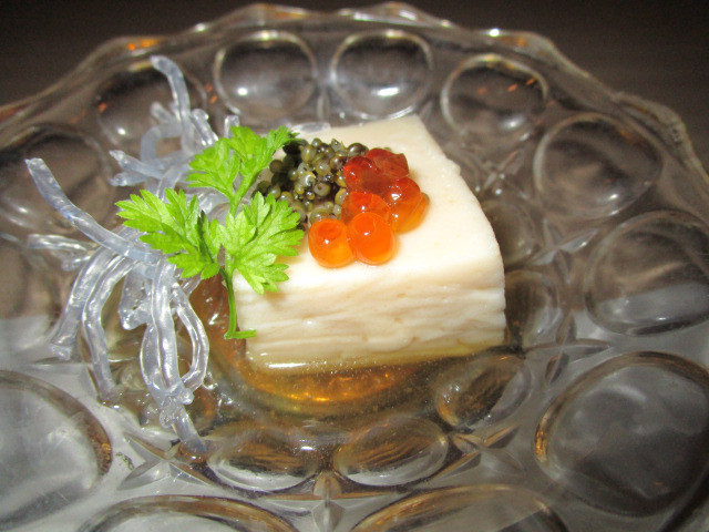 鮟肝と豆乳の葛餅豆腐 畑のキャビア 五食あられ・・