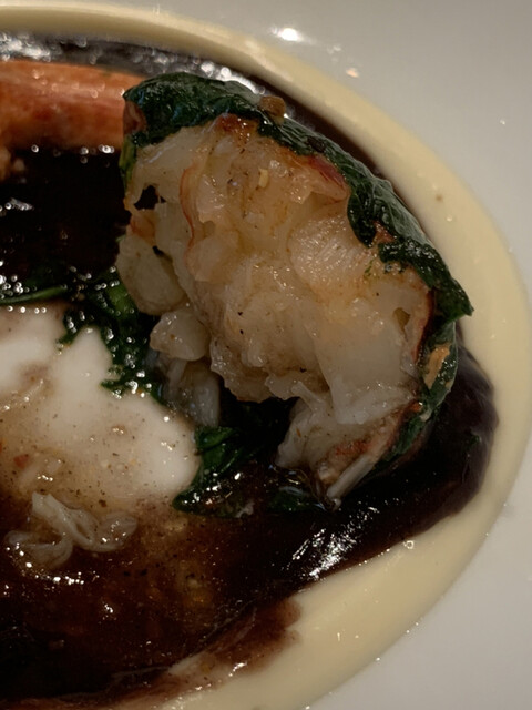 ヴァプール(蒸す)したオマール海老の使い、赤ワインのソースに合わせた一品。爪部分はバターで味つけているとのこと、身の部分はほうれん草に包まれて蒸されている。オマール海老自体、素晴らしい出汁が出る身なのでジューシーな味わいを楽しめるが、それに赤ワインのソースが抜群に合い、別で頼んだ赤ワインとのマリアージュが最高。