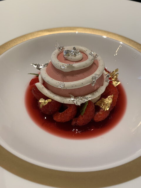 こちらも滑らか、という表現を使わざるを得ない口当たりで、ムースとソルベ両方とも違う調理法のものであるのに、まるで同じもののような似た食感を楽しめるため、口の中でお互いに邪魔し合わずに綺麗に融合する。フランボワーズのムースはさっぱりした甘さ、下に並んでいる木苺自体は元来の甘酸っぱさが感じるので、間にフロマージュプランのソルベの仄かな酸味と一緒に合わせると完璧なハーモニーになると感じる。