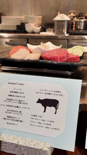 【スタンダードコース】A5ランク黒毛和牛「大吟醸カット」ステーキ、大粒北海ホタテ塩水ウニのせ、選べる御飯物など