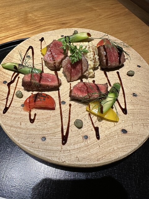 ・脂が少なく、旨味が濃い良質な あか牛で、噛むほどに肉の旨さが溢れます。バルサミコ酸の甘酸っぱさが肉を包み込み立体的な味わいに。