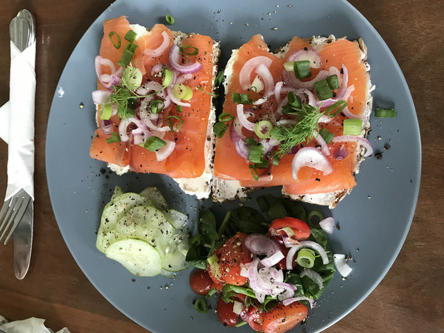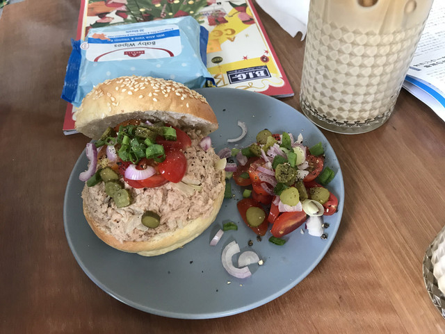 大体、定番のセットメニューのほか、ケーキセットなどもあるようです。私は一番ボリュームがありそうなセットメニューにしてみたのですが、一見、そんなに量は多そうではなかったのですが、パンが重いパン(密度があるパン)で食べているうちにお腹一杯になってしまいました。飲み物のラテを含めて非常に美味しく食べれました。どちらかというと子供がオーダーしたサーモンのサンドイッチの方があっさりしていて、食べやすそうでした。