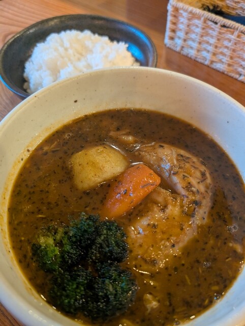 初訪問なのでチキンを注文。骨付きもも肉と人参、茄子、ジャガイモ、獅子唐、ブロッコリー、薩摩芋が入った褐色のスープ。