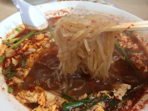 オーソドックスに3(中辛)のこんにゃく麺を選択。ニラ玉スープで食べる冷麺的食感。