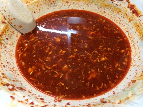 スーパー激辛にニラをトッピングしてみました。そう言えば、トマトの辛麺っての食べてないな。