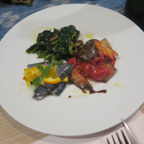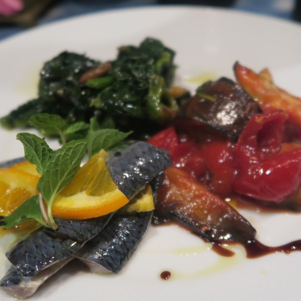 料理は店主がひとりですべて作るので、注文が重なると待つことになりますが、前菜盛りはすぐに出せるということで、まずはそれから。すると、ほうれん草のソテー、カポナータとともに盛られた、イワシのマリネにビックリ!脂がノッたイワシはトロける美味しさで、酢で軽く締めてあるので重さや臭みもなく、オレンジの香りも食欲をそそります♪