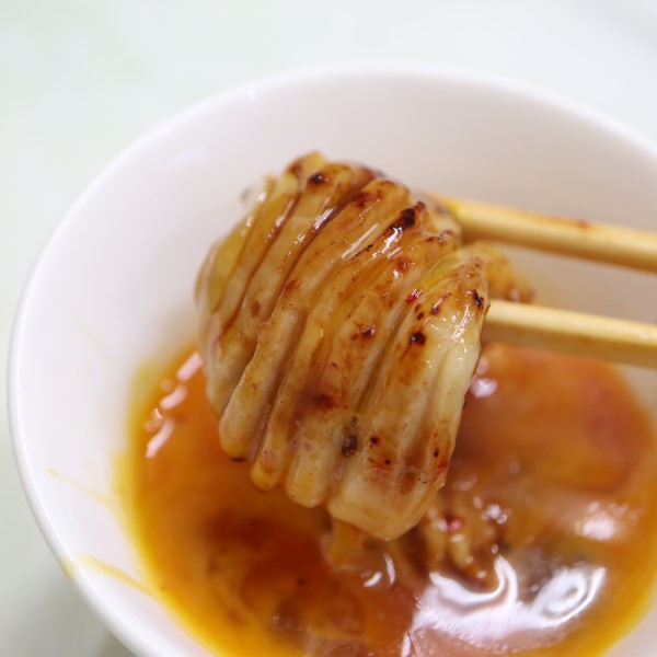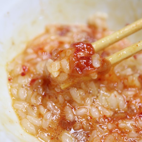 さいごの仕上げは、ごはんに残った生卵をぶっかけ、そこにチャンジャをオンしちゃう!