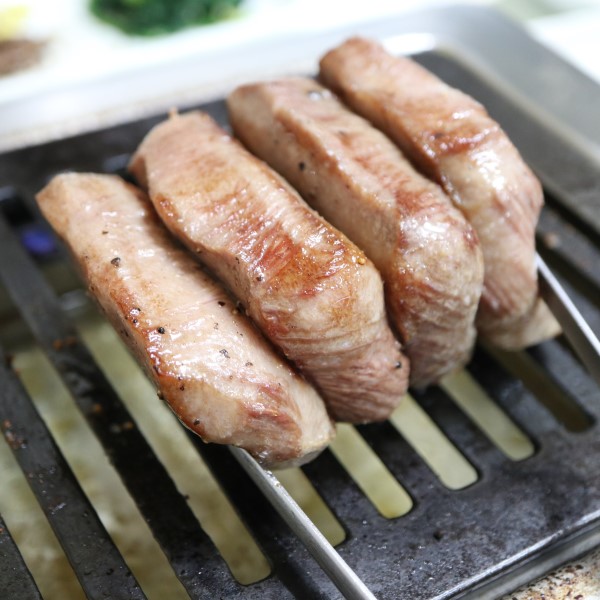 その際、まとめてサイドを焼いたほうが効率的なので、トングで4枚まとめて挟みつつ、さらに4枚まとめてひっくり返す技があります。そう、これぞ、タンをターンさせる「ハッピーターン」という秘密奥義です!