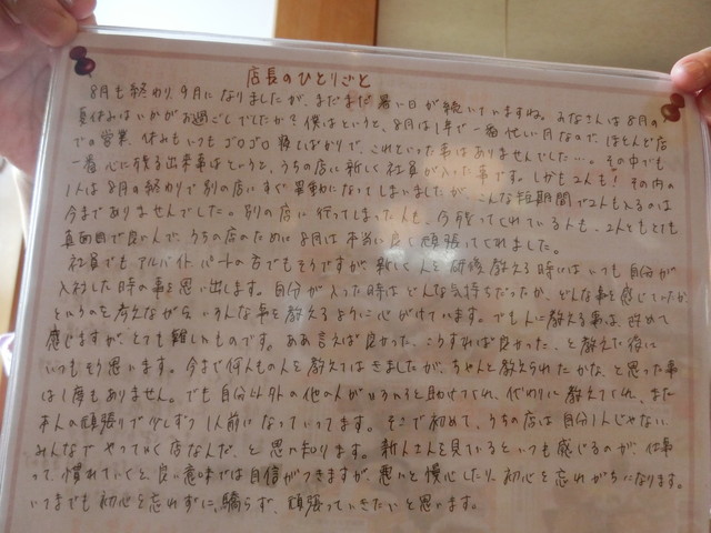 店長さんが書かれた最後の「店長のひとりごと」は、みほり峠下松店で働いている従業員さん達に感謝の気持ちを本心から伝えておられました。店長さんは10月1日に異動されたそうで、新しい防府の店でもあっという間にそこの従業員のみなさんから親しみを持たれたことでしょう。