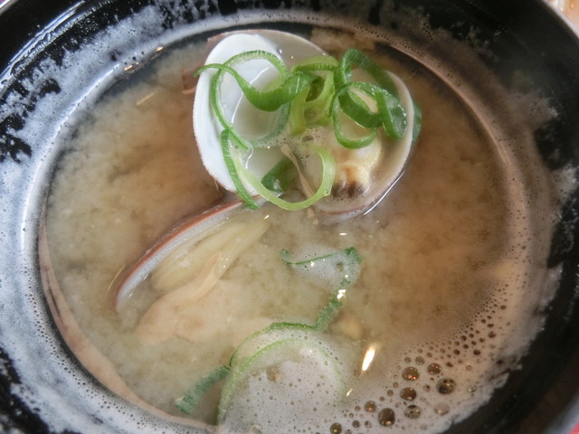 それから、単品の貝汁も美味しく食べました。汁椀の中の貝の数は予想どおりで、向かい席の相方にニコッとしました。