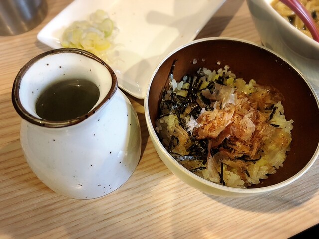 【限定】もち姫太麺の釜玉風混ぜそば(ワサビ飯付き)、ワサビ飯と〆の出汁(茶漬け用)