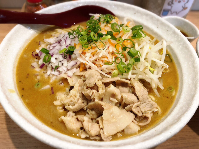 色彩豊かな具材は、肉も野菜もボリューミーで実に食べ応えがある。沢山入ったモヤシは丁度良い固さの食感で、シャキシャキした刻み玉ねぎは甘辛さが程良くて、上述の濃厚でクリーミーなスープを最後まで飽きさせない。