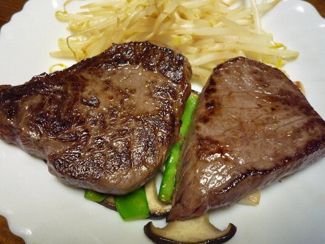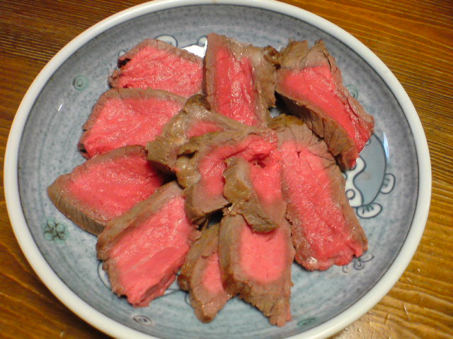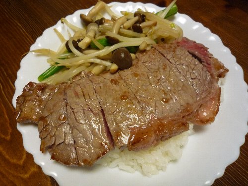 牛ヒレ肉のステーキとカツオ醤油漬け丼、缶ビール付き