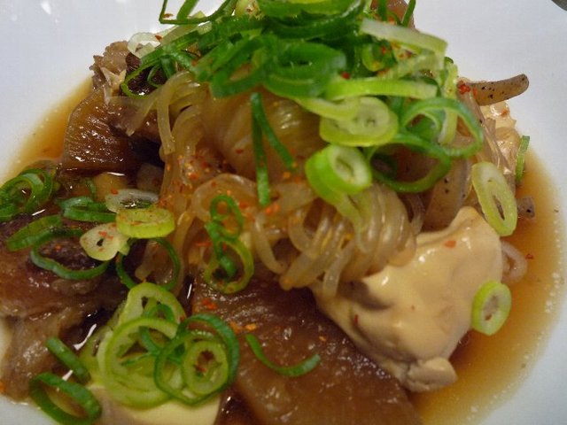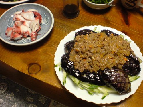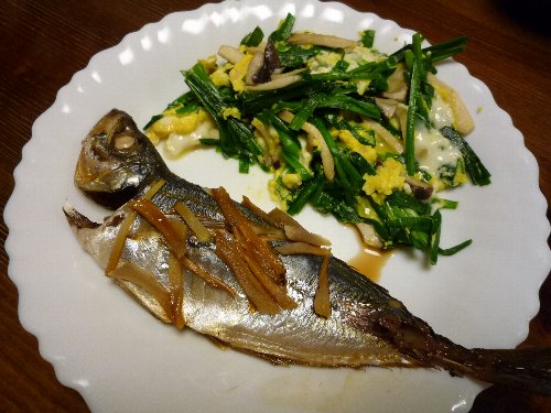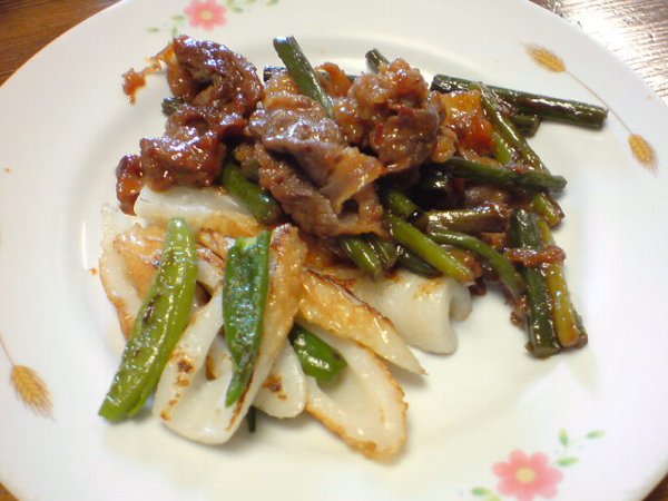 牛肉と大蒜の茎の炒め物(半既製品)、竹輪炒め添え