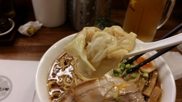 特製のトッピングには、とろとろの味玉、ジューシーなチャーシューが2枚、もっちりしたワンタン、メンマが乗った。