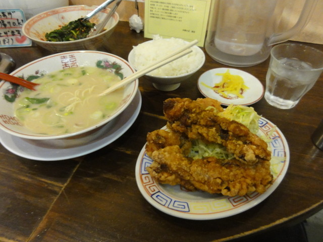 トッピング・・5 チャーシュー、ねぎ、メンマが入ってました。そしてセットのから揚げは、大きさが特大。そしてうまい。