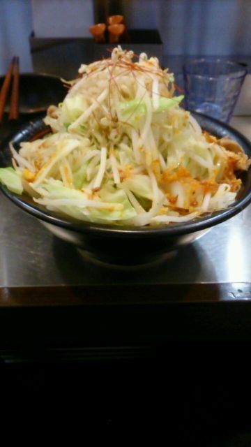 トッピング・・4.5 野菜大盛りにしたら、二郎風な感じの野菜タワーが出てきました。野菜と肉がとても多いです。