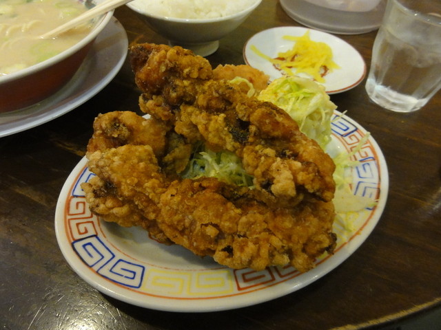 トッピング・・5 チャーシュー、ねぎ、メンマが入ってました。そしてセットのから揚げは、大きさが特大。そしてうまい。