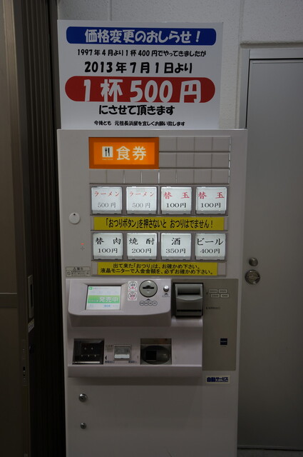 ラーメン500円を自動券売機で買いました。自動券売機は、やたら見やすいというか、わかりやすいというか。ちなみに、口コミを見ると、昔は400円だったみたいですね。