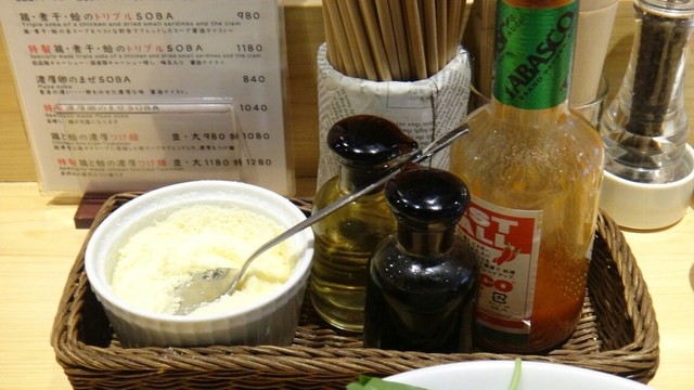 トッピング・・4 ねぎ、メンマ、チャーシュー、のり、水菜、かまぼこみたいなものあたりが入っていました。そして調味料として、粉チーズとかタバスコとかがありました。せっかくなので、粉チーズをかけまくりました。