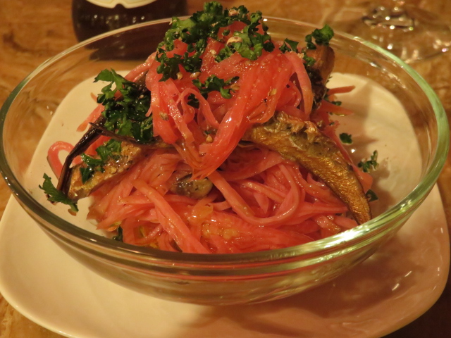 まずは野菜でさっぱりと。紅芯大根のラペのシャキシャキとした中に塩気のあるアンチョビでお酒が進みます。