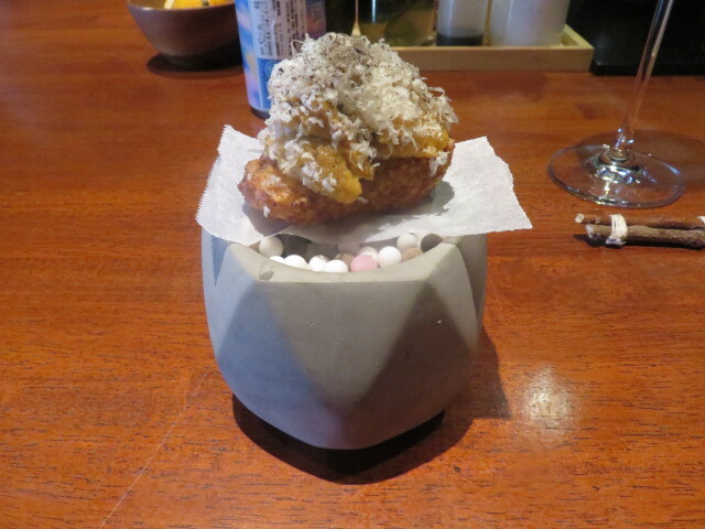 マグロの持つ生臭みを感じさせず、トウモロコシの甘味とマグロの旨味を、クリームチーズを介することでうまくまとめ上げています。