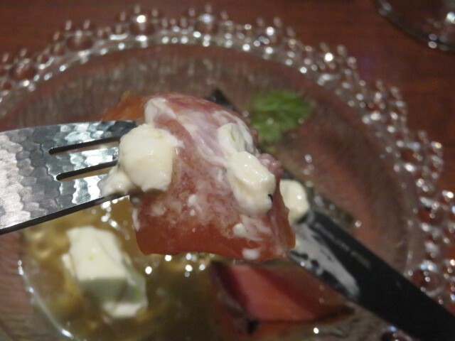 角切りにしたマグロにトウモロコシを合わせ、ソースはクリームチーズにアンチョビを混ぜた(と言っていたような?)もの。