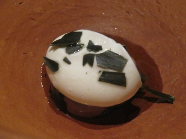 塩水に浸けたウズラの黄身を崩していただきます。