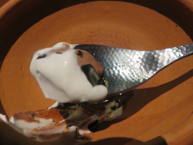 佐渡のショコラティエから入手したというカカオを使い、クリームの上には炙った昆布を散らして。甘すぎない、大人のデザート。