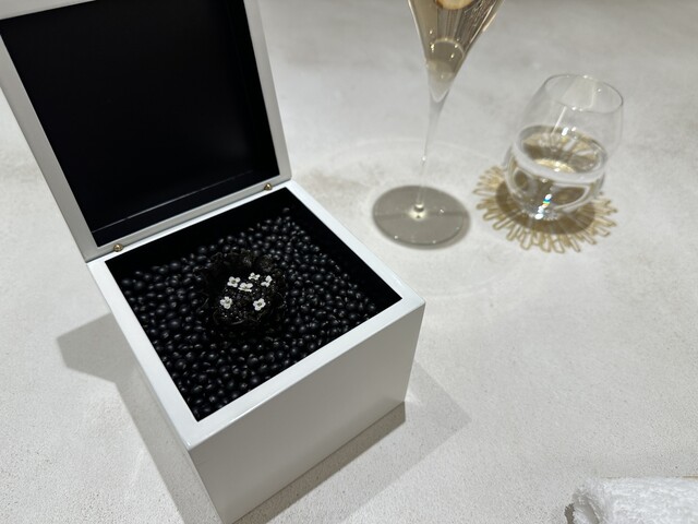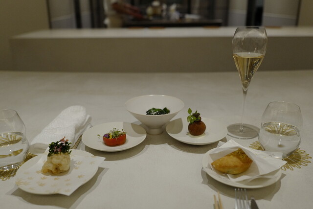 前菜にはキャビア、生ハム、サーモン、トマト、その他の冬の旬の味覚が盛り付けられています
