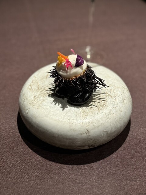 ✔️本当は牡蠣とトマトだったんだけど、急遽変えていただきました。濃厚なウニがたっぷり詰まった上には真っ白なトマトのムース。ウニの甘みとトマトの酸味が素敵なコラボ