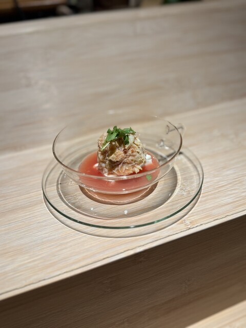 ✔️一品目の毛蟹のモッツァレラババロアは、発酵トマトスープと一緒に堪能。鮨屋で出てくるとは驚きの一皿。洋だけど、しっかりの和の旨みを感じる和洋の融合に感動します。