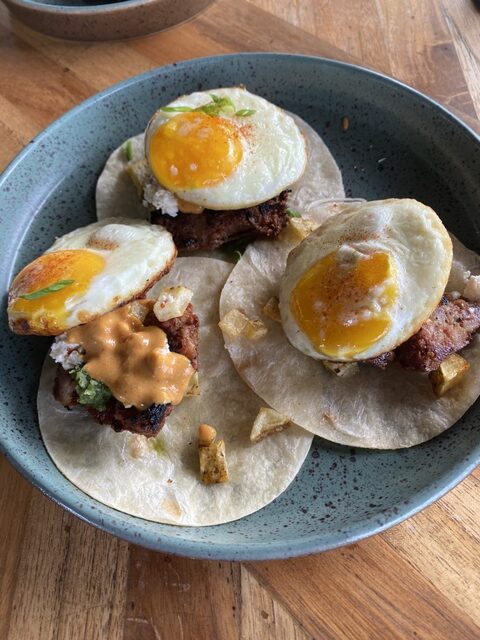 食事はBalineseChorizoTacosをオーダー。目玉焼きがカリカリで美味しい。バビグリン的な雰囲気の味でした。