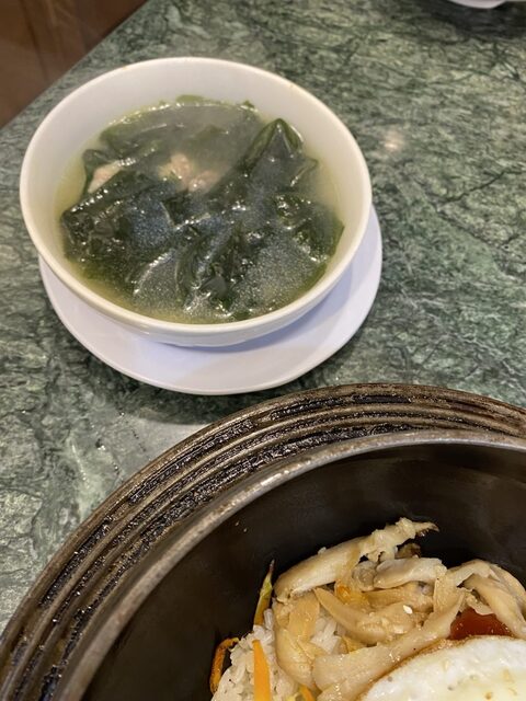 石焼ビビンパに付いてくるワカメスープは美味しい。日本の一般的な焼き肉屋で食べるスープよりも濃厚です。
