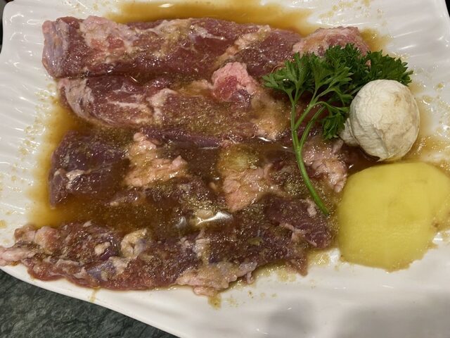 とりあえずタン塩。肉質が特別良い訳ではありませんが、量が多いのが嬉しい。奥にあるのは骨付きカルビ、これは必ず食べたいですね。