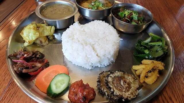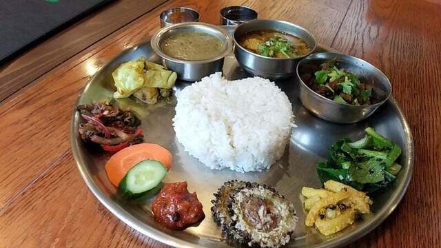 チキンカレー、行者ニンニク入りポークカレー、酸味の強い発酵タケノコとジャガイモのカレーの3種かけに行者ニンニクのマトンキーマカレーを追加。濃厚なダール、山椒薫るトマトアチャール、ゴーヤのアチャールなど、オカズいっぱいの定食を頬張る。超絶旨し!!