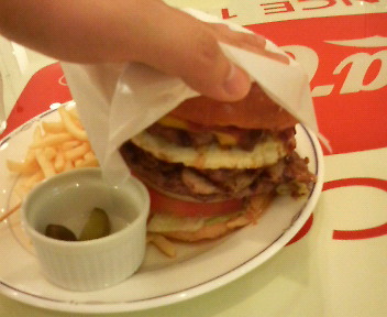 特大サイズのハッピーバーガーほどではないにせよ、ファストフード系ハンバーガーを想定していると相当なボリュームに参ることでしょう。