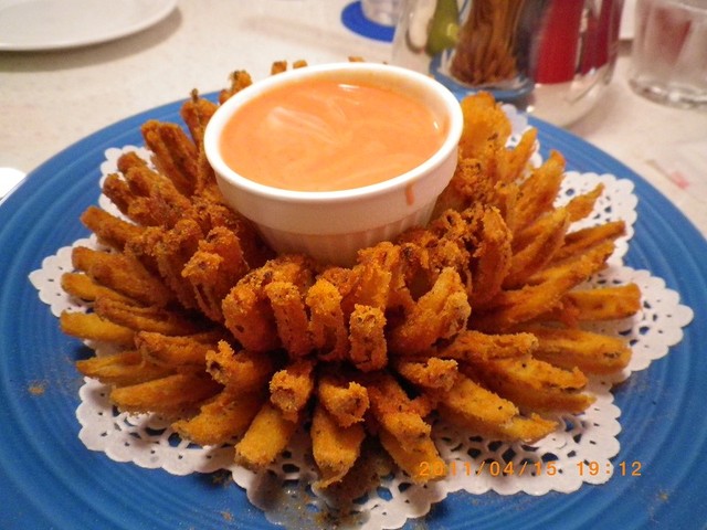 玉ねぎ一個を丸ごと揚げたオニオンブロッサムは、サイドメニューとしてはボリュームが大。
