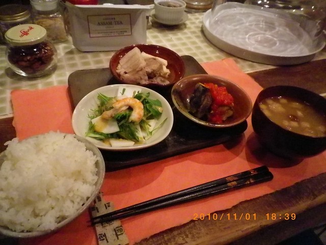 飯も新米でうまいし、豚肉も染みウマだし、サラダも水菜のシャキシャキ感が楽しい。