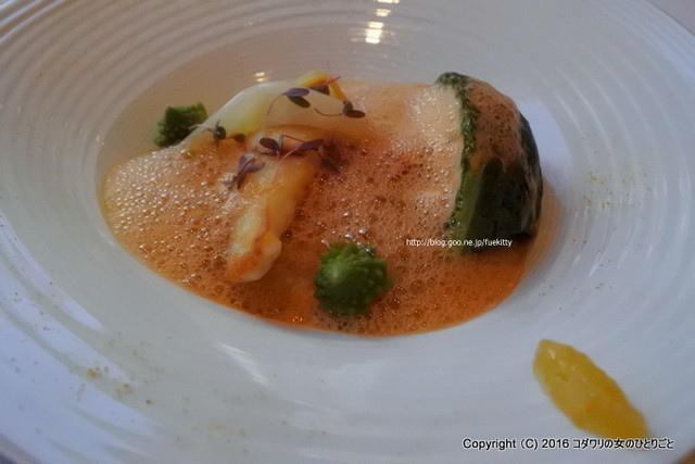 オマールエビのムースを縮緬キャベツで巻き、オマール海老のカプチーノ仕立てのソース。
