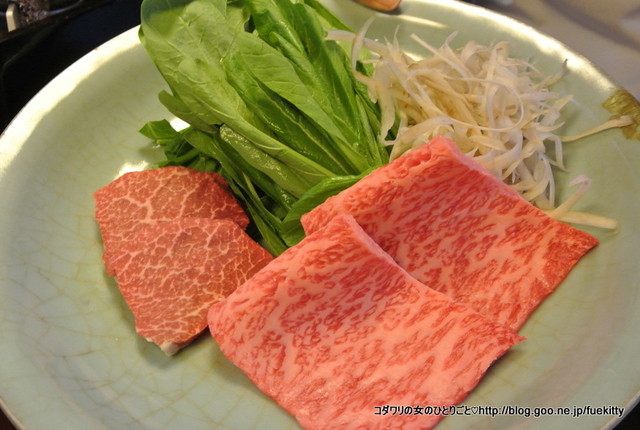 名物でもあるうかい牛すき鍋。部位の違う2種の大きな真四角のお肉が登場します。