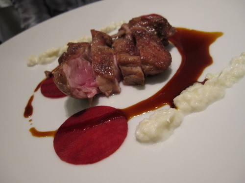「マダムビュルゴーのシャラン鴨もも肉のソテー 白と赤のソース」