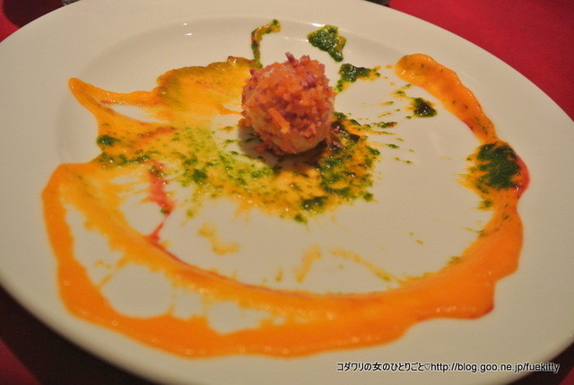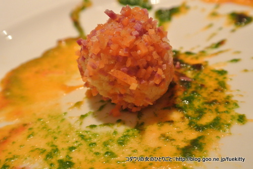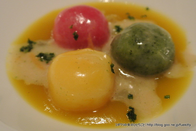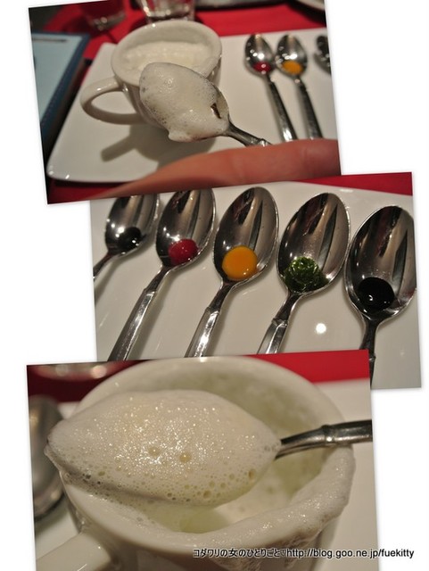 スプーンに5つのソースが盛られて、それでカプチーノカップに入ったパルミジャーノソースをすくっていただくのです。